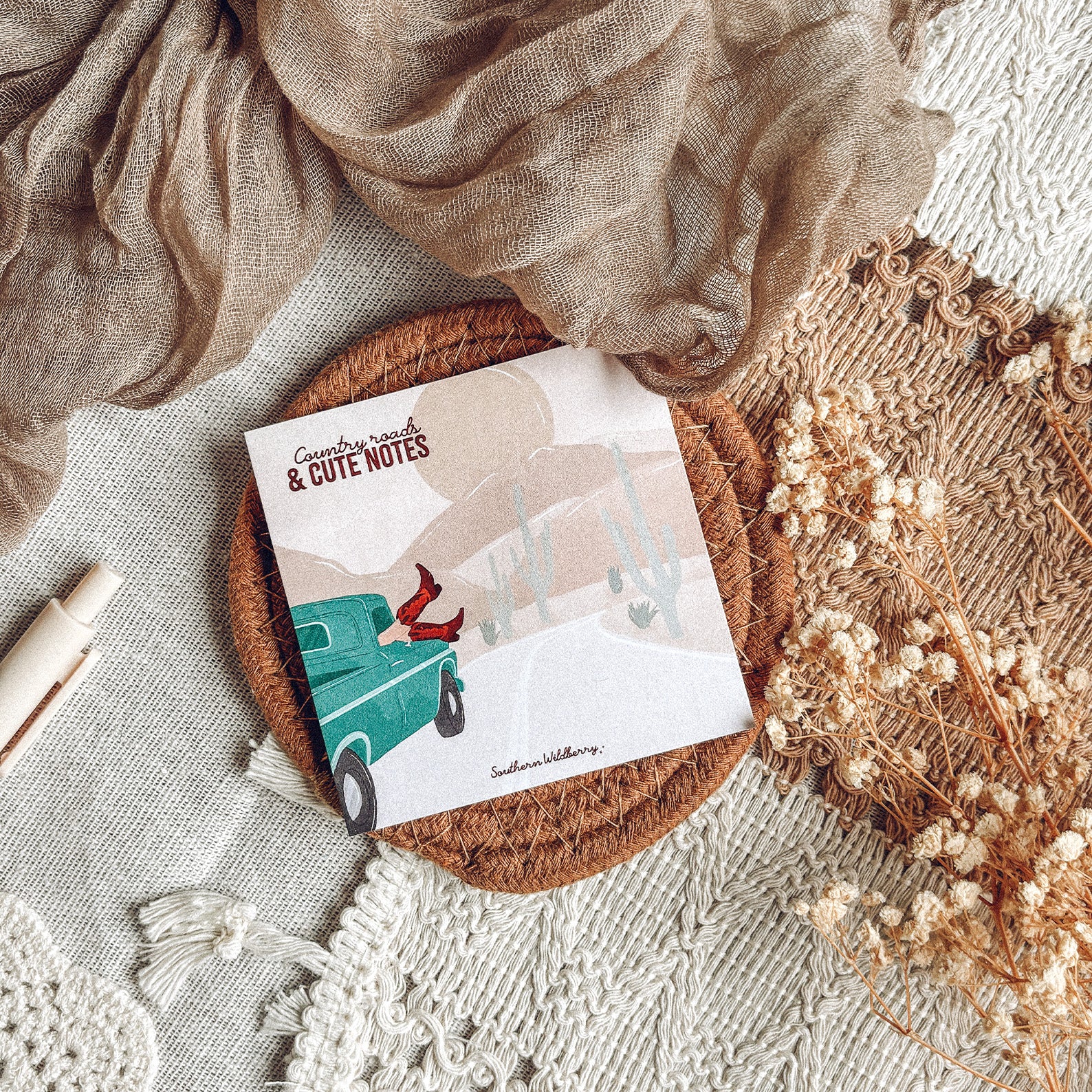 Because your reminders deserve a little country magic. The Country Roads and Cute Notes sticky notes feature a Southern Wildberry illustration of a cowgirl kicking her boots out the truck window on a desert road. Perfect for jotting down to do lists, leaving sweet notes, or adding a little western flair to your workspace made for country music lovers and stationery fans alike.
