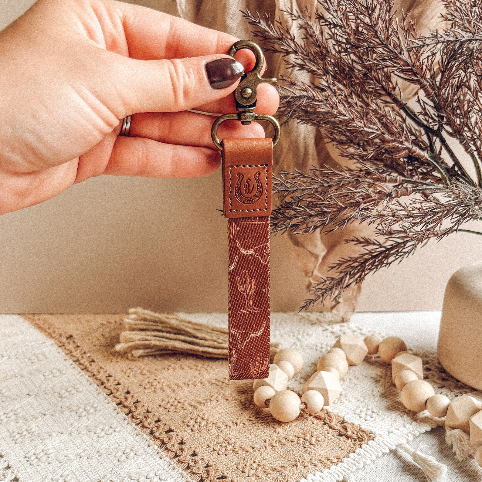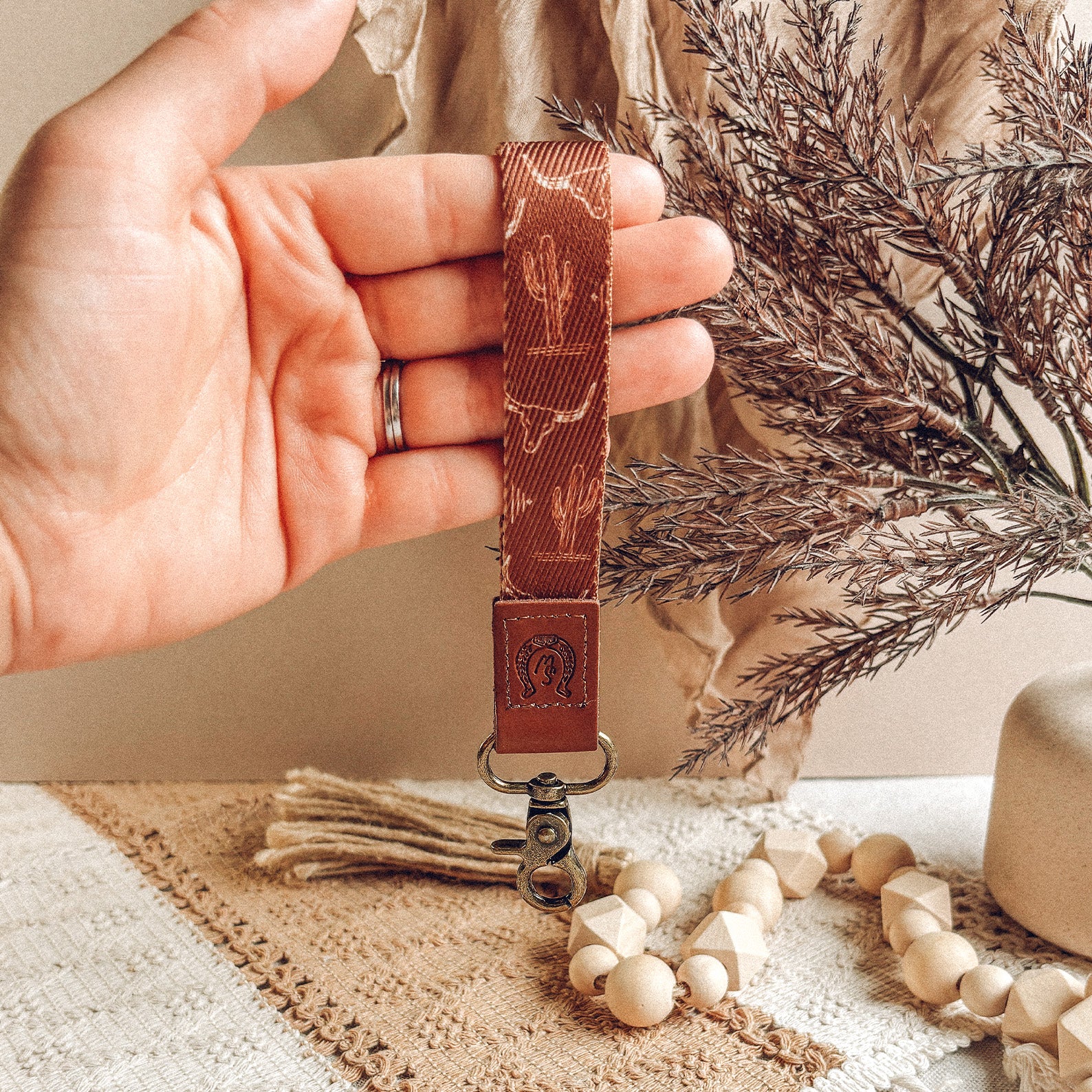 The Desert Dreams keychain loop features a deep brown background patterned with illustrated cactuses and longhorn skulls, printed seamlessly inside and out. Finished with the Southern Wildberry logo and a bronze 360-degree clasp, it’s sturdy, practical, and easy to attach to keys, bags or belt loops. A western inspired accessory with just the right touch of wild.