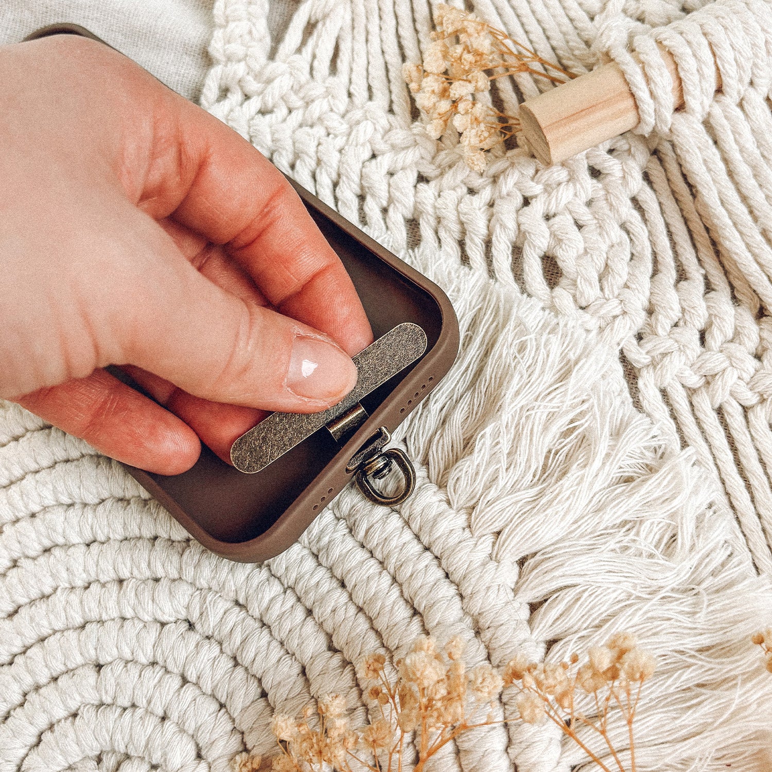 Put the flat part of the tether tab inside your phone case with the Southern Wildberry logo facing down into the case.