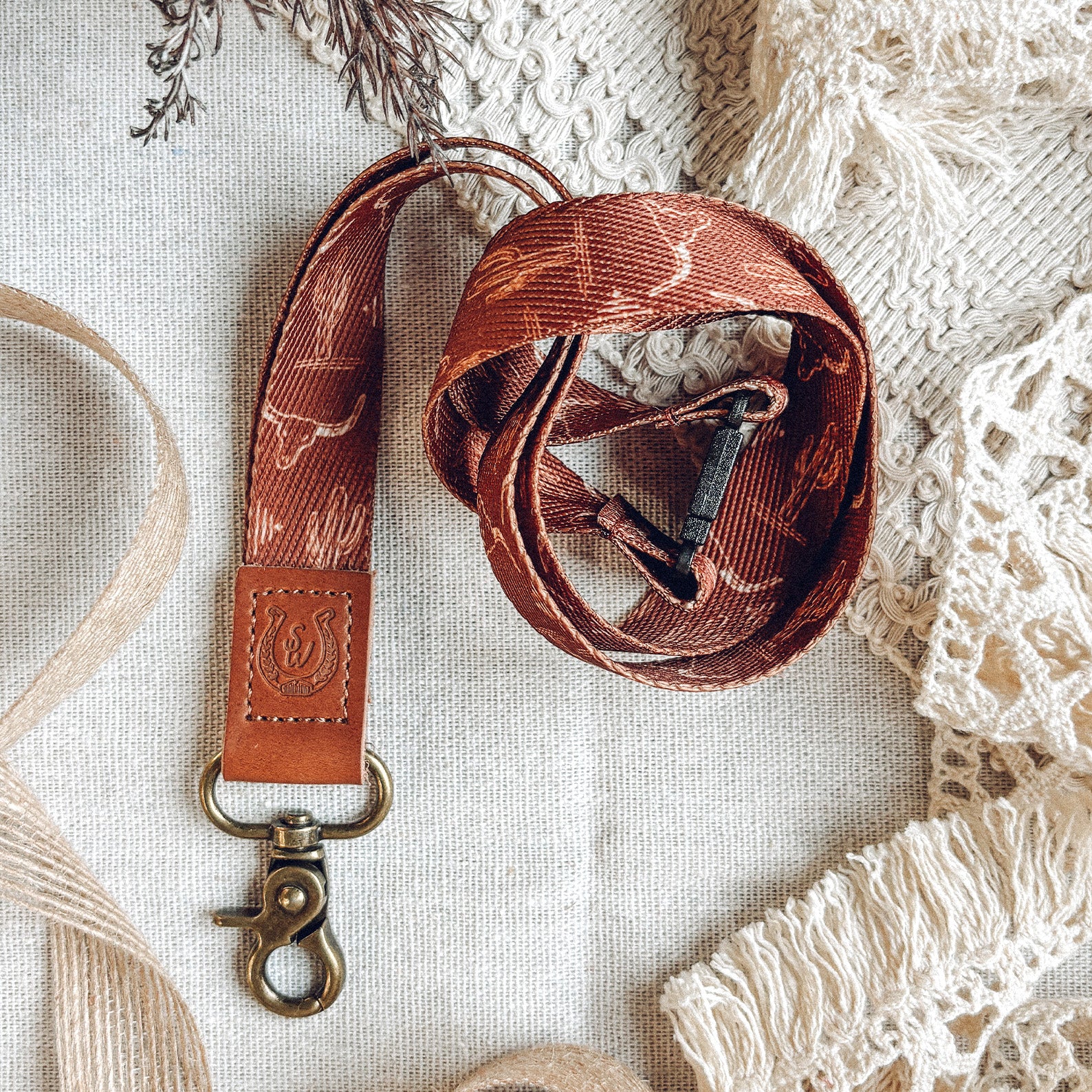 The Desert Dreams lanyard features a deep brown background patterned with illustrated cactuses and longhorn skulls, printed seamlessly inside and out. A subtle western touch made for cowgirls and cowboys who like their everyday essentials with a hint of wild.