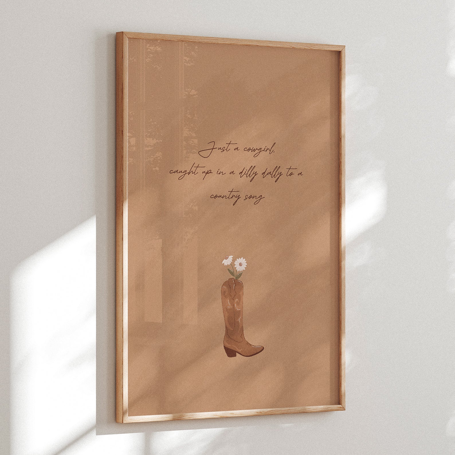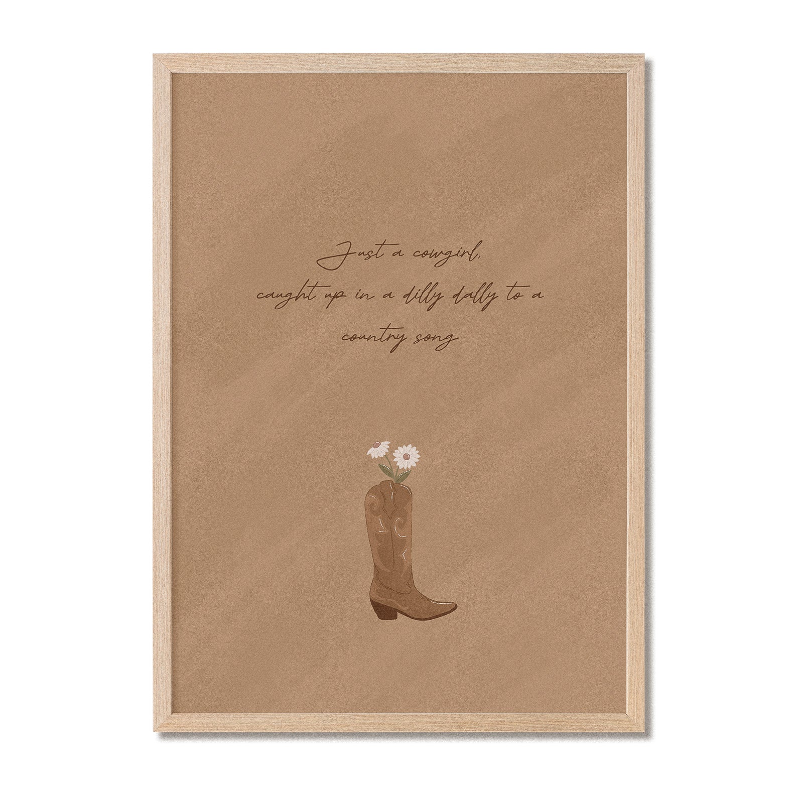 “Just a cowgirl, caught up in a dilly dally to a country song.” This illustrated print pairs playful lettering with a rustic brown cowboy boot filled with flowers. A sweet nod to slow moments, country music, and the cowgirl spirit, it’s perfect for bedrooms, reading nooks, or gifting to your favourite country loving friend.