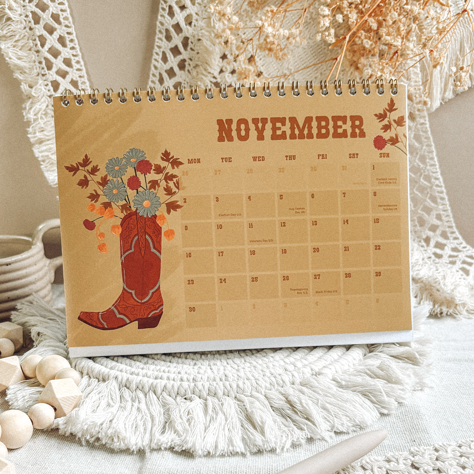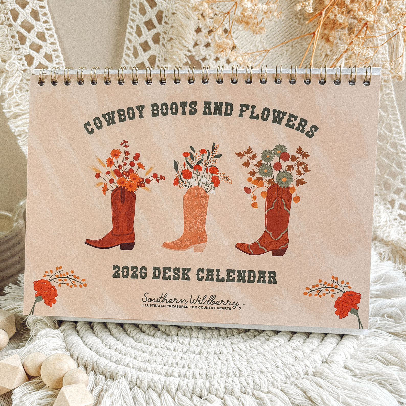 A year in bloom, the western way. The Cowboy Boots and Flowers Desk Calendar 2026 features twelve months of seasonal florals paired with illustrated cowboy boots a little reminder that every season has its own kind of beauty.