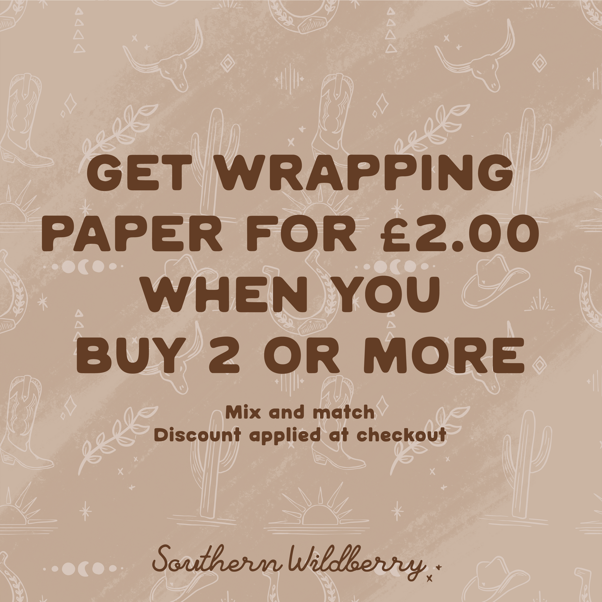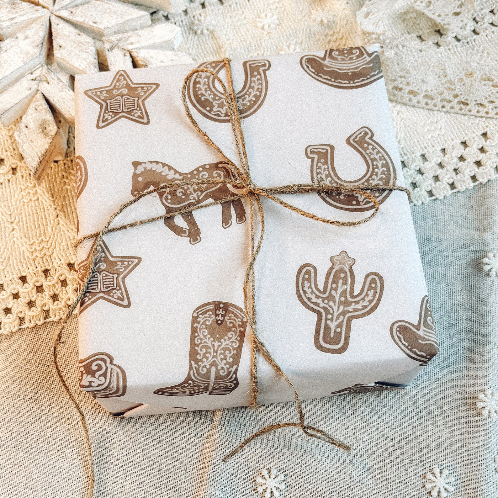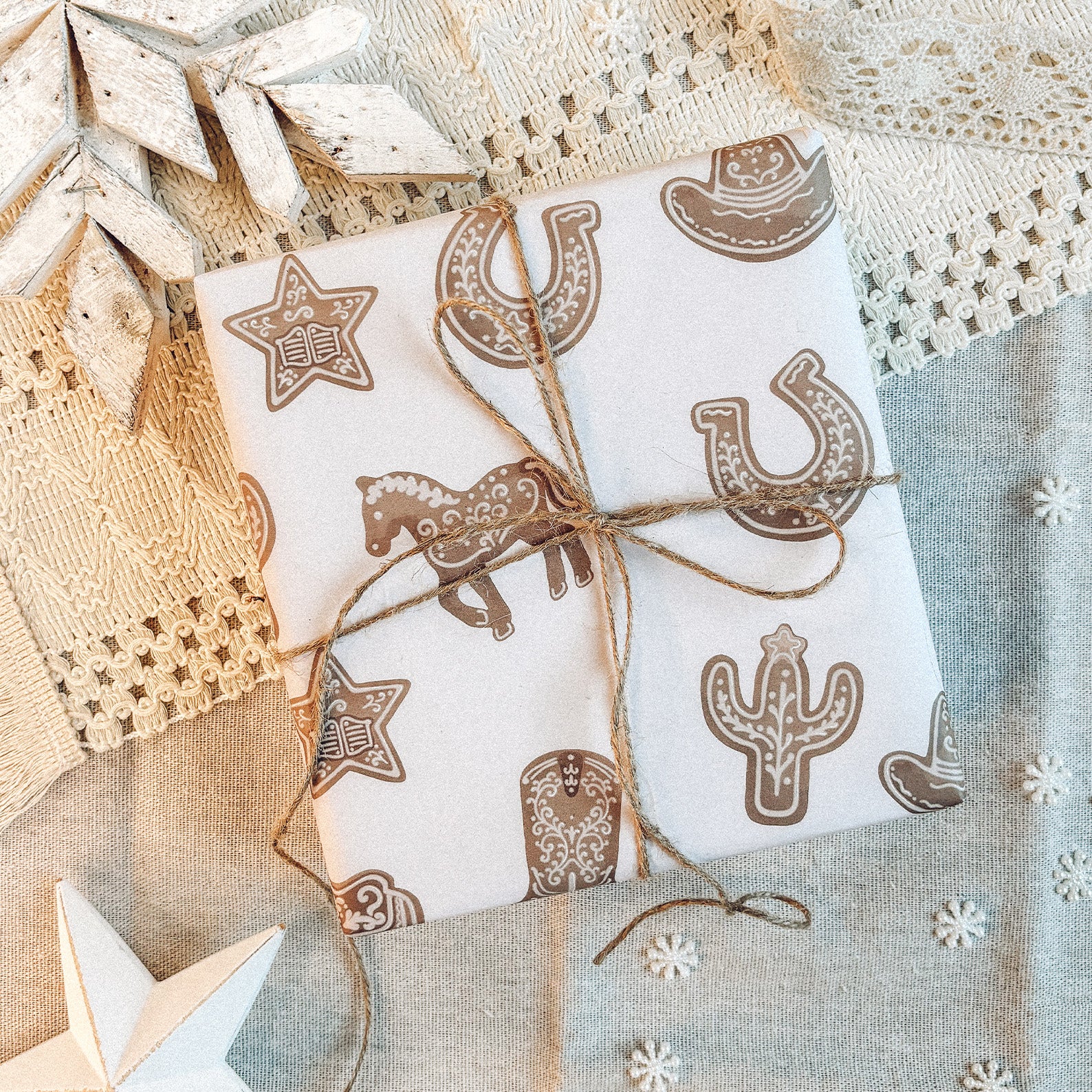Wrap your presents in true western style with The Wild West Bakehouse wrapping paper. Featuring a seamless pattern of gingerbread cookies horses, horseshoes, saddles, cactus, cowboy hats and boots it’s a sweet nod to Christmas on the ranch. Sold per sheet, it’s the perfect finishing touch for gifts baked with love and a sprinkle of country charm.